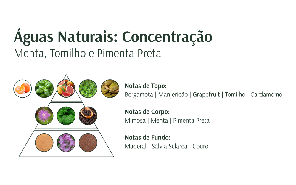 As fragrâncias de menta, tomilho e pimenta preta são as protagonistas dessa Água Refrescante que cria uma experiência de concentração. As nuances provocam um mergulho no equilíbrio necessário para manter sua rotina com foco e assertividade. As notas geladas e refrescantes despertam o corpo e enchem o dia a dia de disposição.