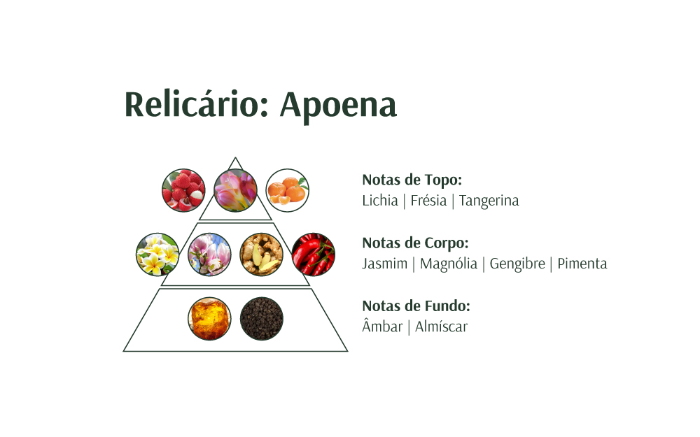 A estrutura olfativa de Apoena conta com notas refrescantes de tangerina e frésia de topo; no corpo, a combinação floral frutada de jasmim, gengibre e magnólia; para as notas de fundo, a profundidade quente de âmbar e almíscar.