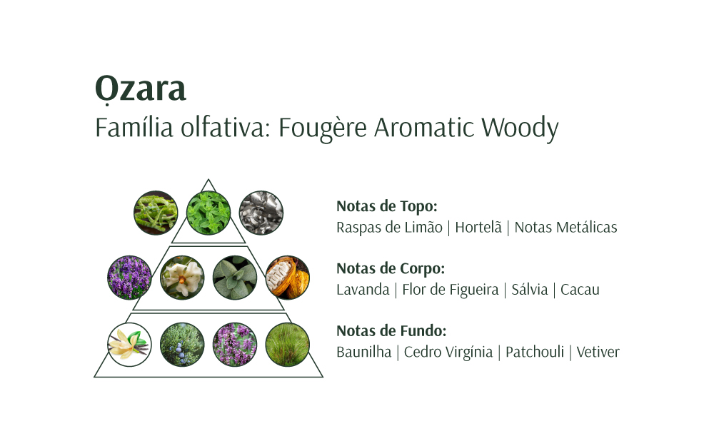 Ozara é uma fragrância agênero, vencedora do 31º Prêmio Atualidade Cosmética, com notas frescas e amadeiradas.