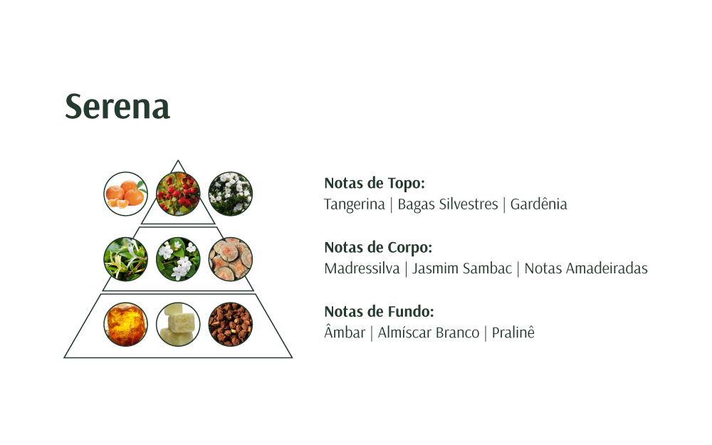 Os últimos raios de sol brilham no céu e inspiram a harmonia da fragrância Serena. As suas nuances florais e amadeiradas combinam-se, magicamente, para um efeito de mistério e sedução. Um perfume intimista com toques de encanto e sofisticação.