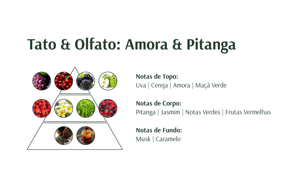 A fragrância Amora & Pitanga, da linha Tato & Olfato, combina notas frutadas de uva, cereja e maçã verde com o toque vibrante da pitanga e a suavidade do caramelo. Um perfume alegre e envolvente que traz leveza e vivacidade ao ambiente.