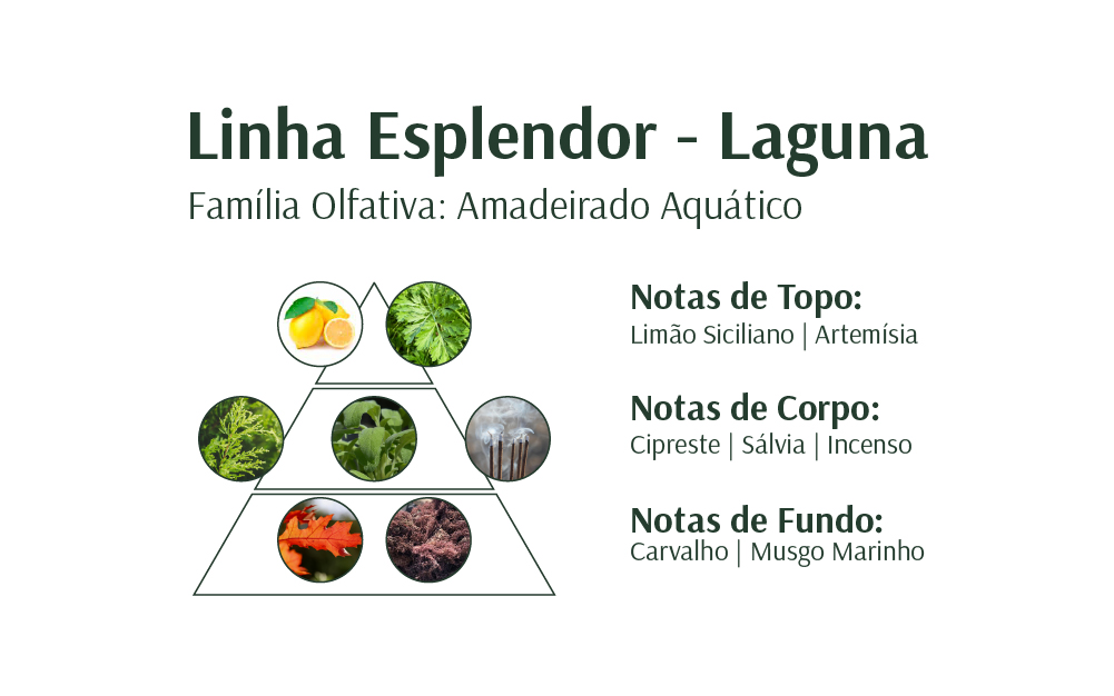 A Essência para Difusor Laguna oferece praticidade e sustentabilidade sem abrir mão da sofisticação olfativa. Sua fórmula mantém a fragrância envolvente da linha, unindo notas amadeiradas e aquáticas com o calor acolhedor da sálvia, do musgo marinho e do carvalho.