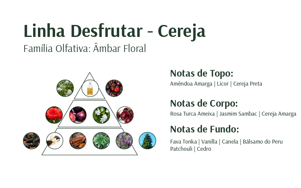 - Sabonete Líquido: O Sabonete Líquido para as Mãos Desfrutar faz do banho um momento relaxante e perfumado. Com uma espuma cremosa, ele limpa a pele suavemente, deixando-a macia, além de irradiar a envolvente fragrância de cereja.